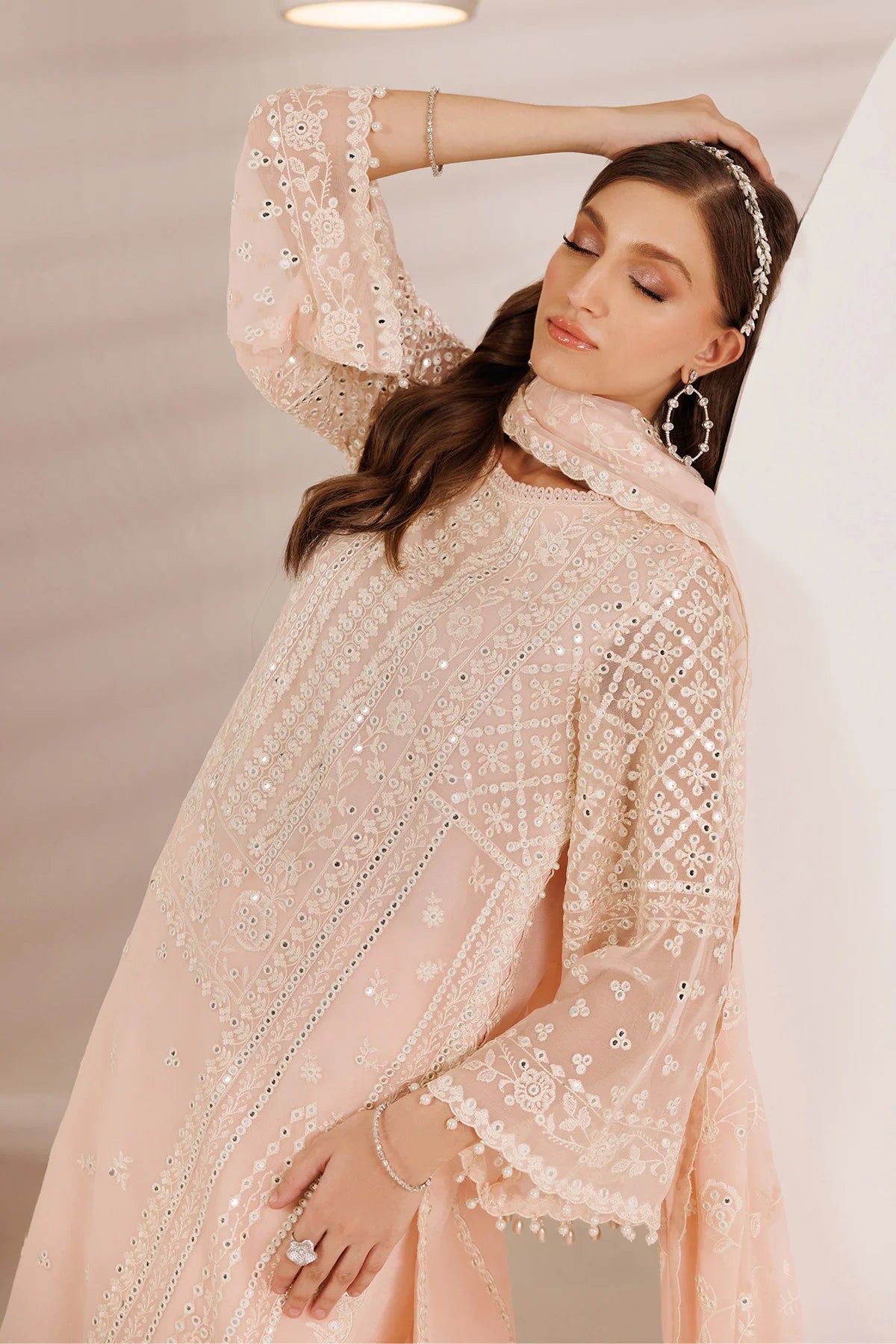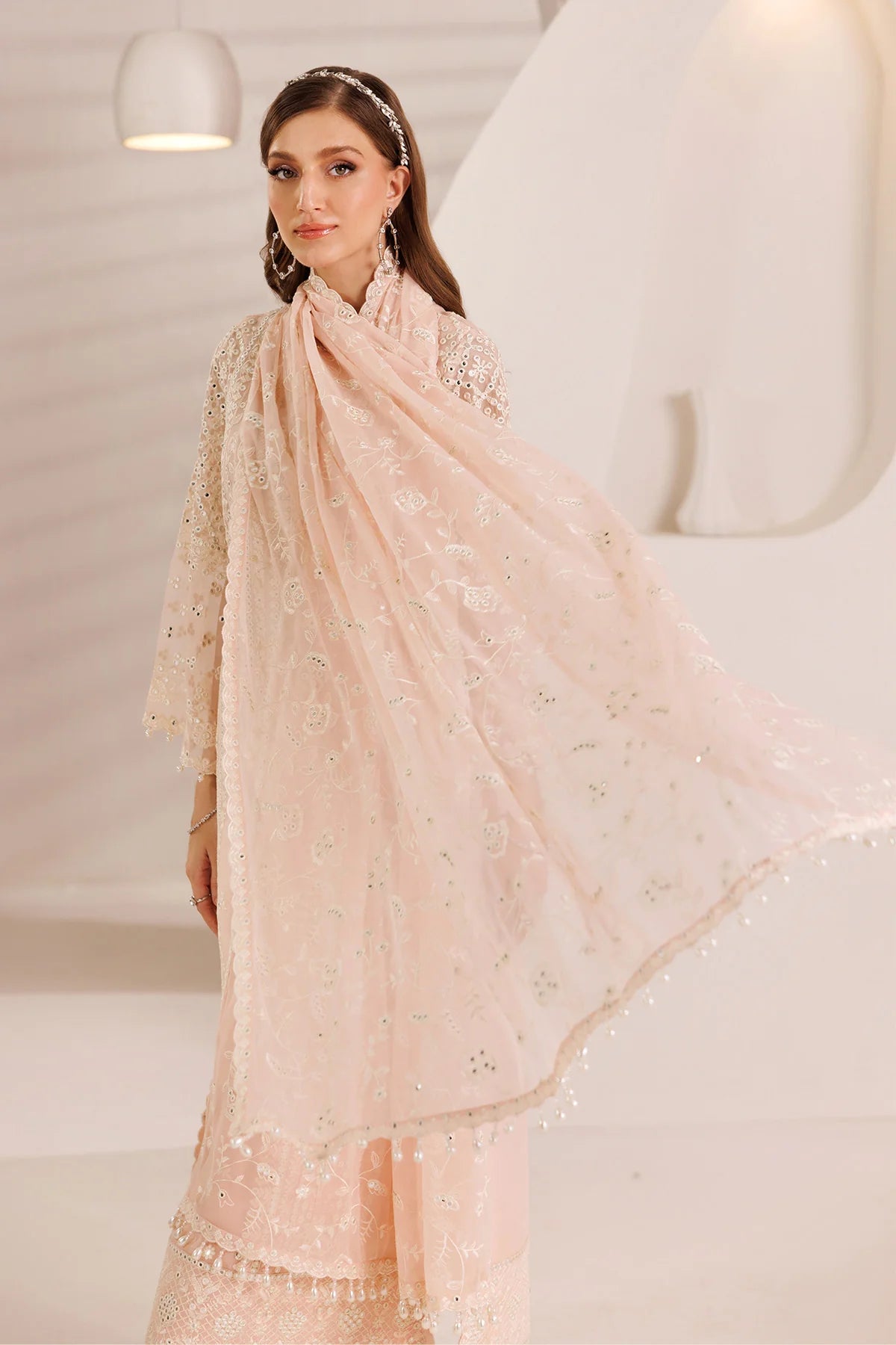 A pastel pink shirt adorned with intricate foil embroidery adds a subtle shimmer to the front, hem, and sleeves with delicate patterns. Paired with raw silk trousers and draped in richly embroidered chiffon dupatta featuring a finely detailed border, this is elegance that speaks softly, but stands strong.
