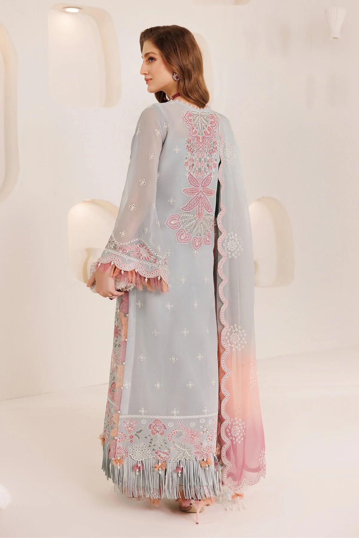 A whisper of lilac in every thread – This embroidered chiffon shirt, featuring tonal embroidery in a vibrant hue, is styled with a beautifully contrasting embroidered dupatta, shaded in pastel tones that blend seamlessly with the ensemble. It is paired with elegant raw silk trousers for a refined, graceful look.