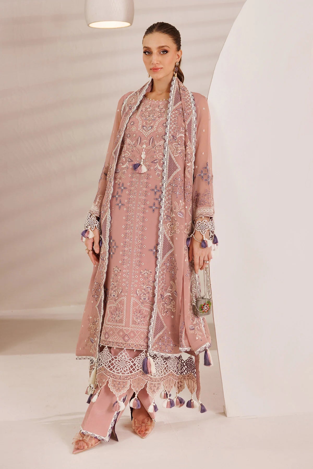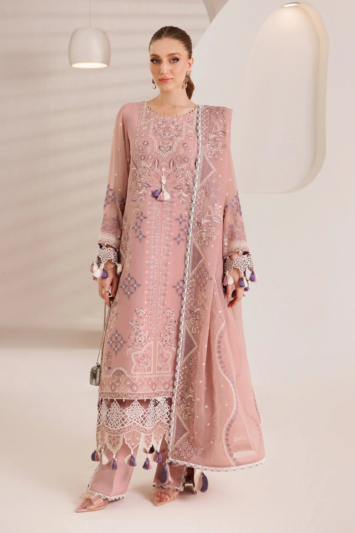 A peachy pink ensemble that radiates soft charm—white and purple contrasting embroidery dances across the chiffon shirt, adorned with beautifully composed motifs, Paired with an embroidered chiffon dupatta and tailored raw silk trousers, this look captures elegance in every detail.