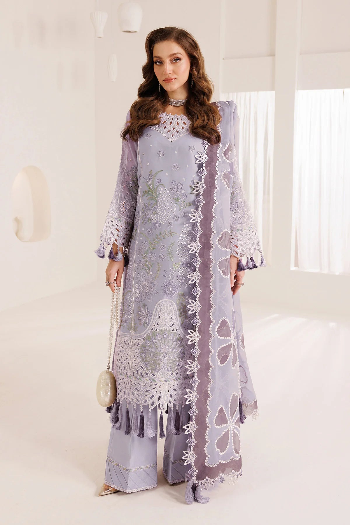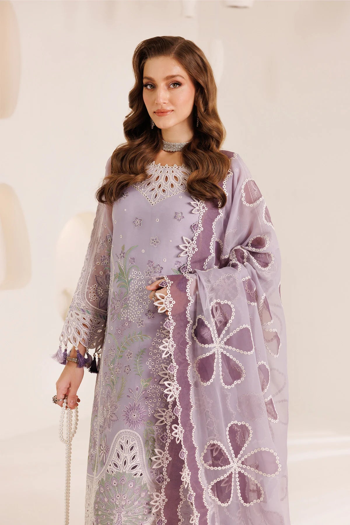 A dreamy light purple ensemble elevated with striking contrasts—dark purple and green threadwork weave through floral embroidery on an airy chiffon shirt, creating a perfect harmony of softness and depth. Paired with a beautifully embroidered chiffon dupatta featuring delicate appliqué work and dyed raw silk trousers, this look is a graceful blend of color and quiet elegance.
