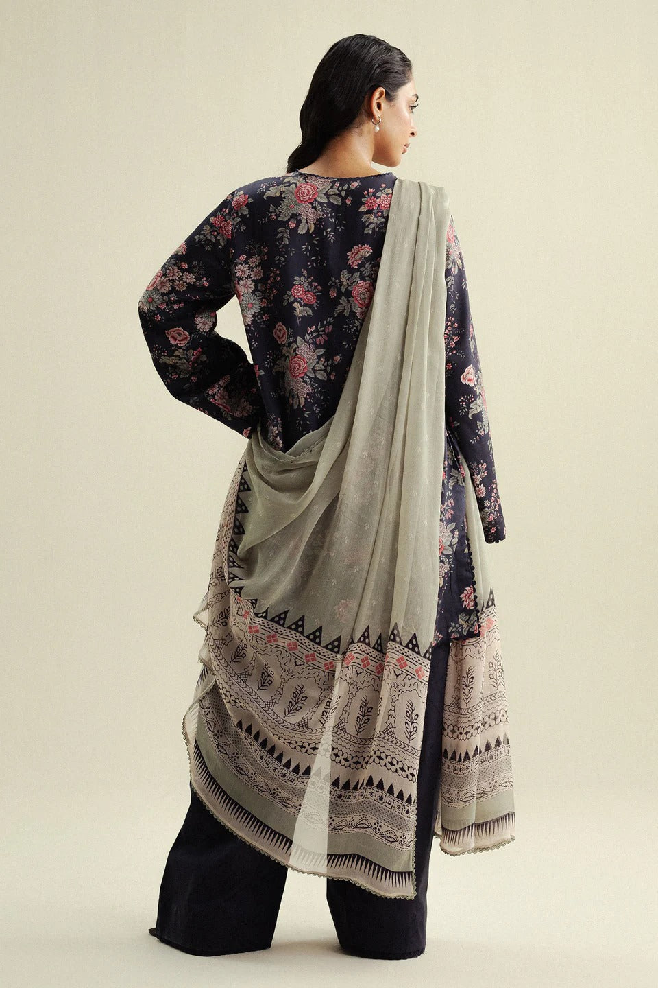 A blue shirt adorned with a vibrant print, paired with a printed trouser and a tuscan blue dupatta that deepens the palette with subtle sophistication.