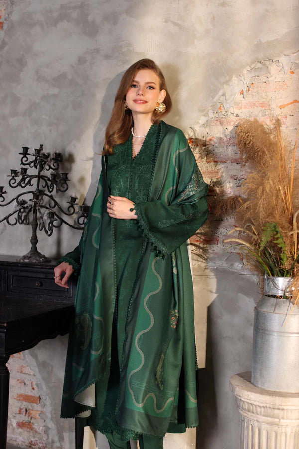 This richly hued, self-textured shirt features intricate embroidered borders and delicate trims that exude refined craftsmanship. It is paired with a self-colored, minimally designed printed shawl, creating a sophisticated balance of texture, tone, and understated elegance — an ideal choice for the winter season.
