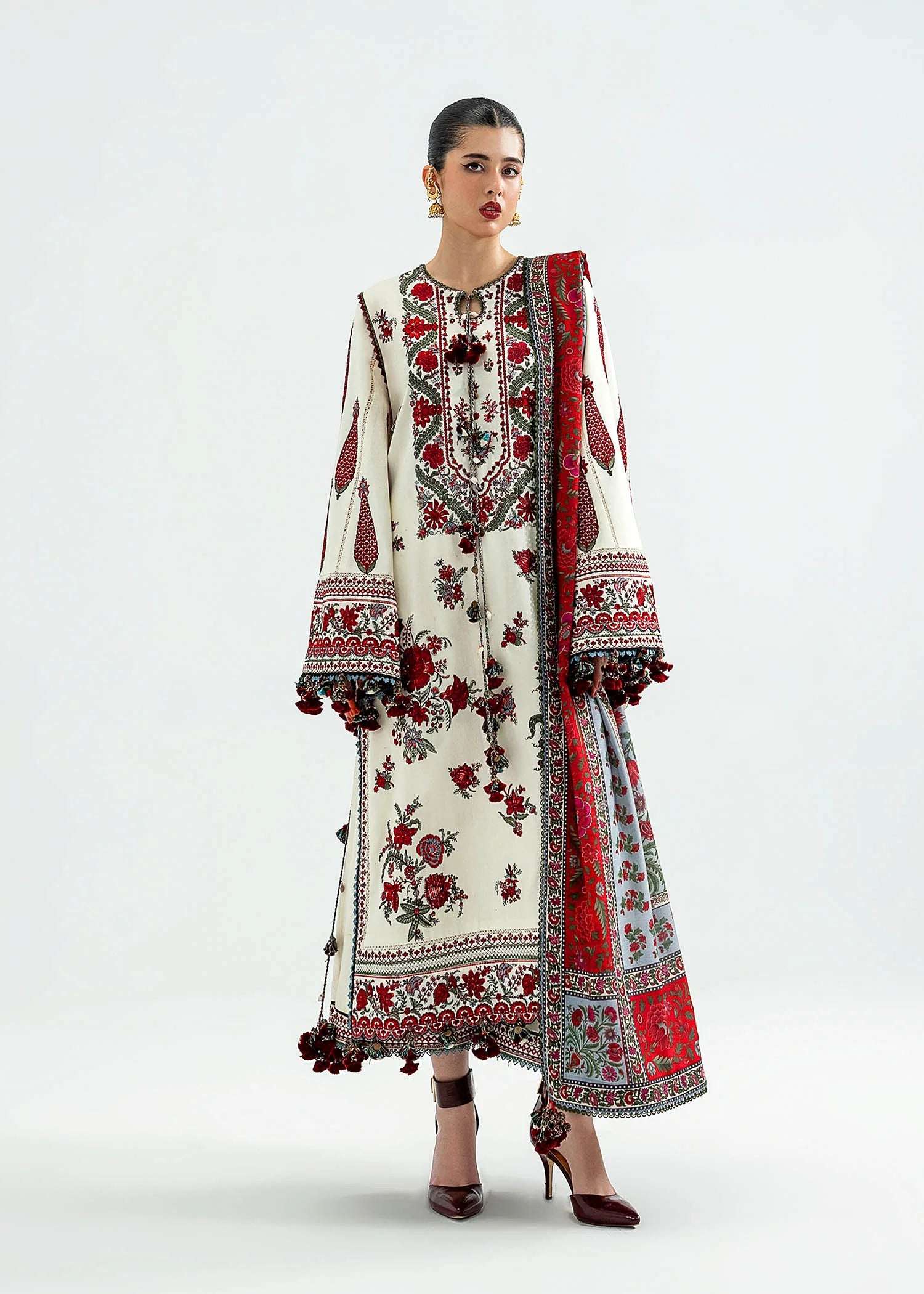 Embrace timeless tradition with this long off -white unstitched khaddar shirt featuring bold, rich embroidery and an elegant square neckline. Inspired by Indian chintz, the design showcases striking red floral motifs at the hem, complemented by intricate borders and traditional sleeve embroidery. Paired with a culotte adorned with a classic border and a contrast sage blue wool shawl featuring traditional floral prints and a printed facing, this ensemble beautifully blends cultural heritage with refined winter sophistication.