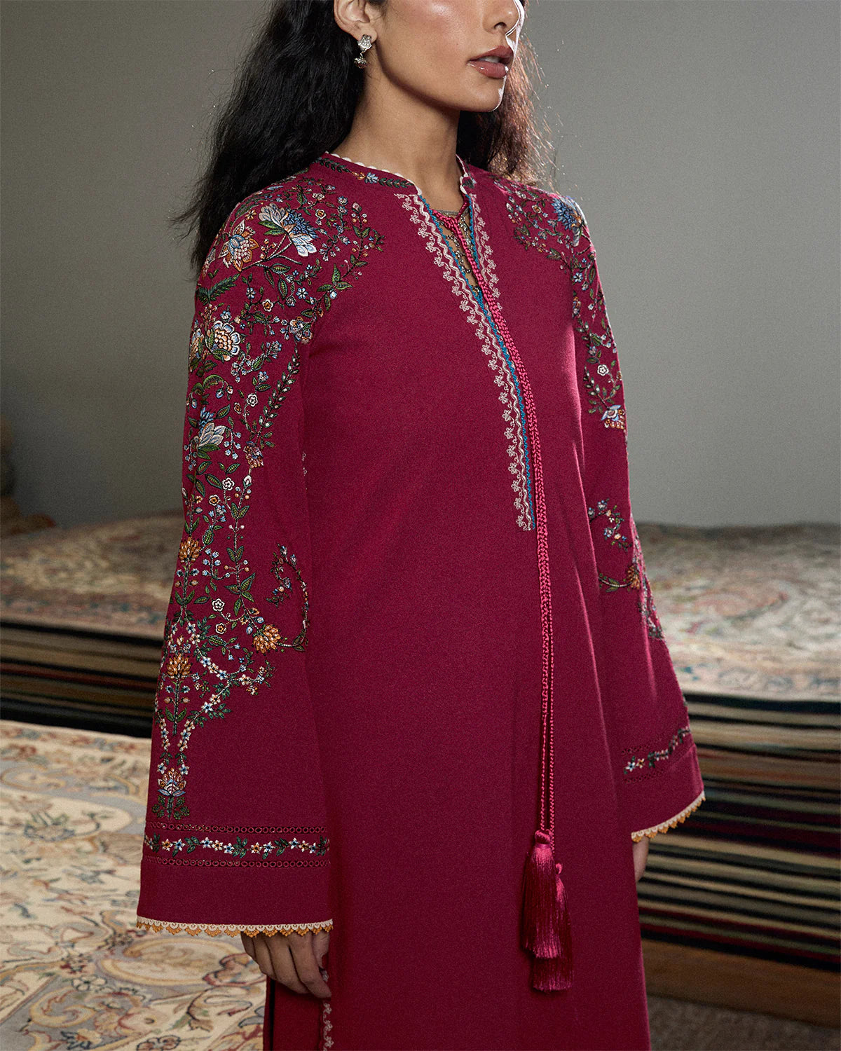 Description: The outfit features a carrot-red shirt adorned with intricate multicolor floral embroidery, radiating traditional elegance. The sleeves echo the same floral motifs, creating a harmonious and refined look, while matching carrot-red shalwar carries the embroidery for a cohesive silhouette. A poly wool printed shawl completes the ensemble, adding texture and a graceful, timeless finish to the traditional attire.