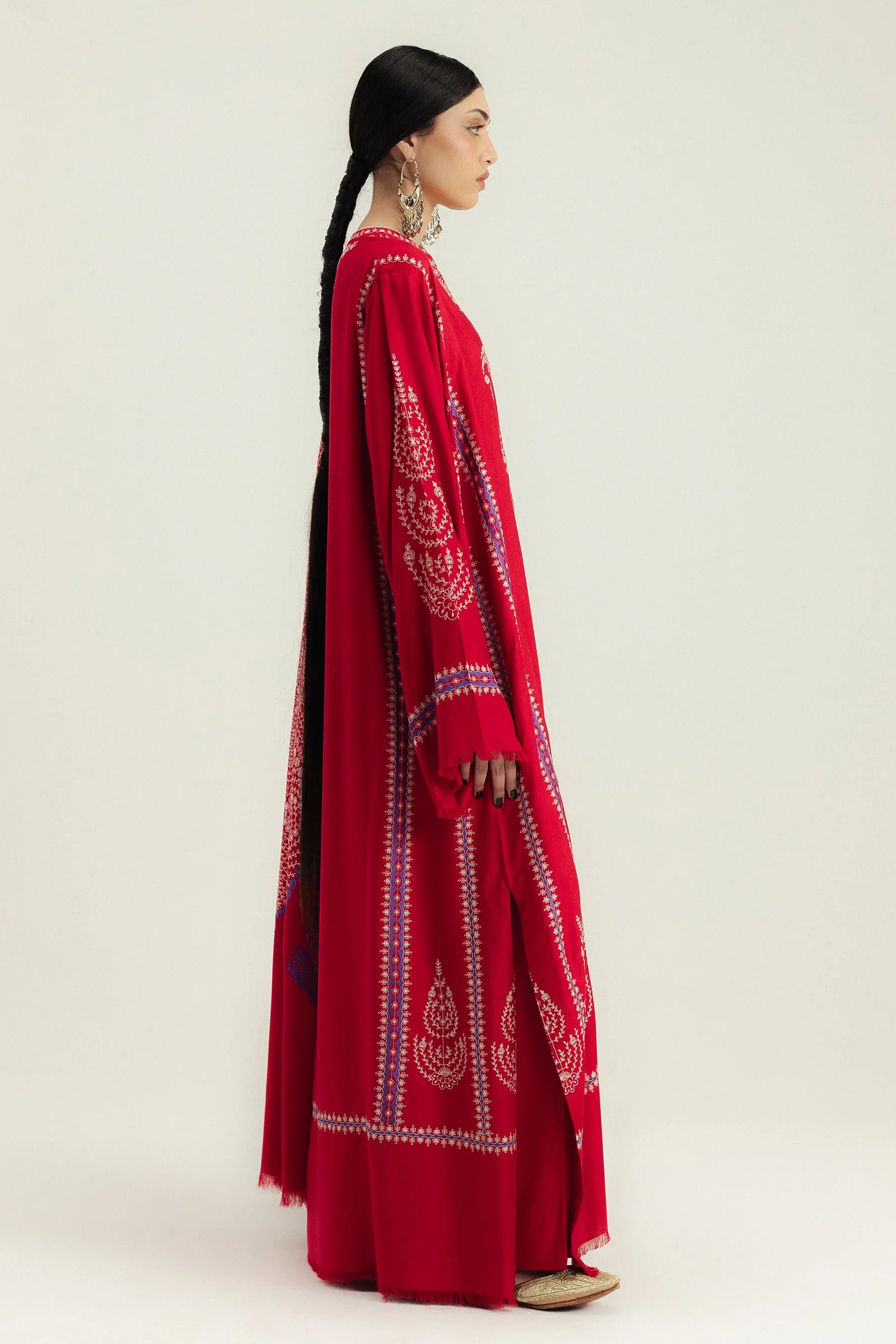 A signature red five-paneled kurta adorned with intricate Kashmiri embroidery on the front and back, showcasing fine craftsmanship and detail. Paired with a heavily embroidered red marina shawl featuring a pop of cobalt blue and matching tonal trousers, this ensemble reflects warmth, heritage, and timeless elegance.