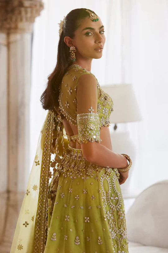 Adorned abundantly with mirror work encased in gold and silver hand embellishments, each motif tells a tale of timeless artistry and opulence. The diaphanous lime tulle dupatta is framed with glistening borders creating a silhouette of regal grace and timeless grandeur.