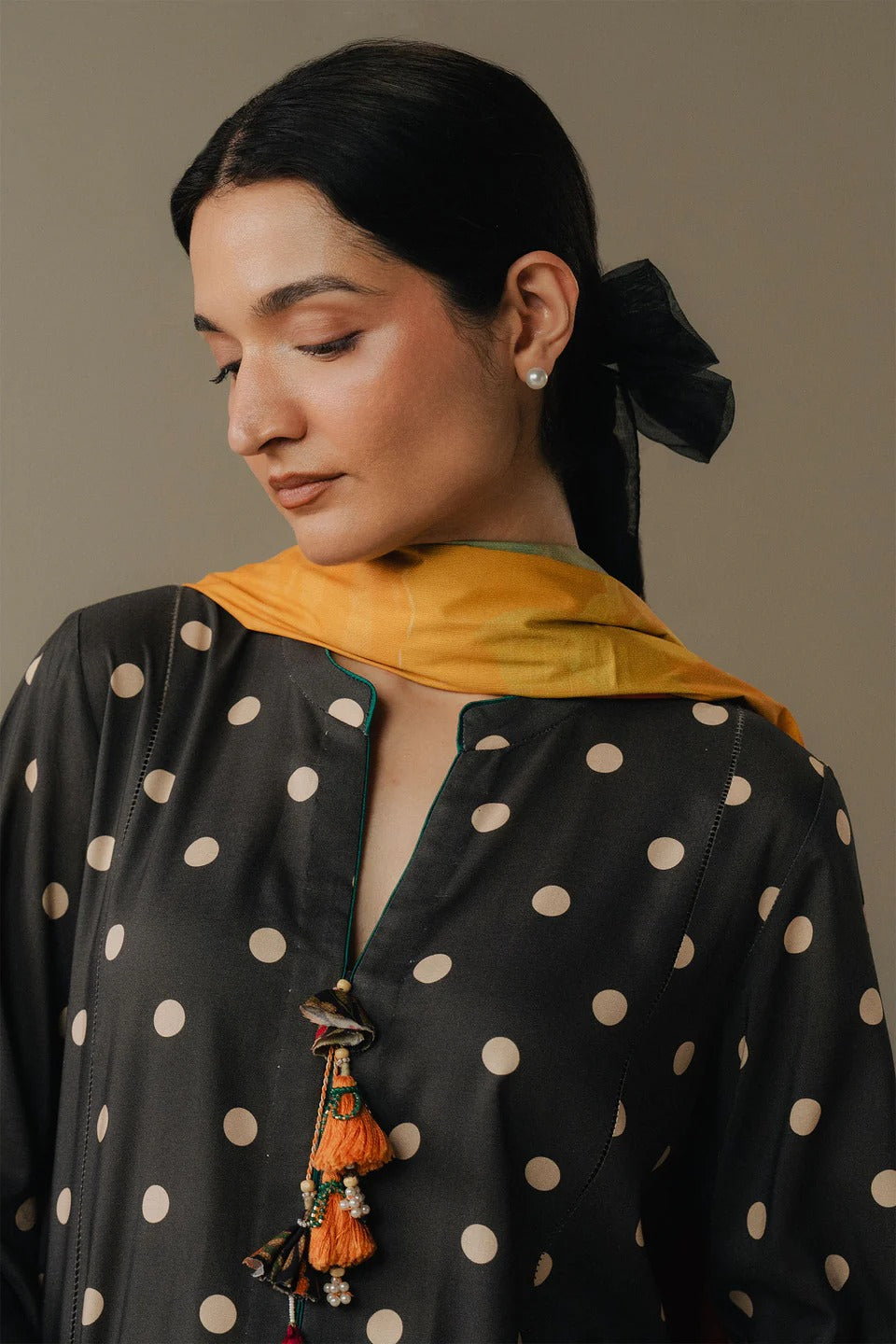 A gray shirt featuring a charming mix of paisley and polka dot patterns, paired with an off-white trouser adorned with delicate floral prints. The look is completed with a multi-colored shawl inspired by traditional pashmina designs, adding warmth, texture, and a touch of timeless elegance.